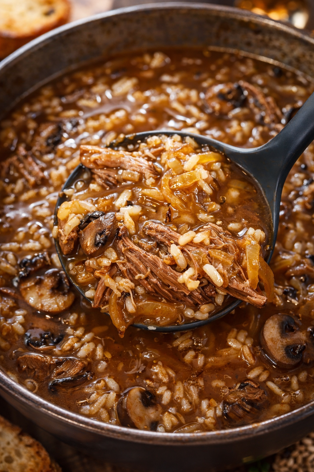 🥣 Slow-Simmered Beef French Onion Soup 🛒 Ingredients 2–3 lbs inside round roast ...